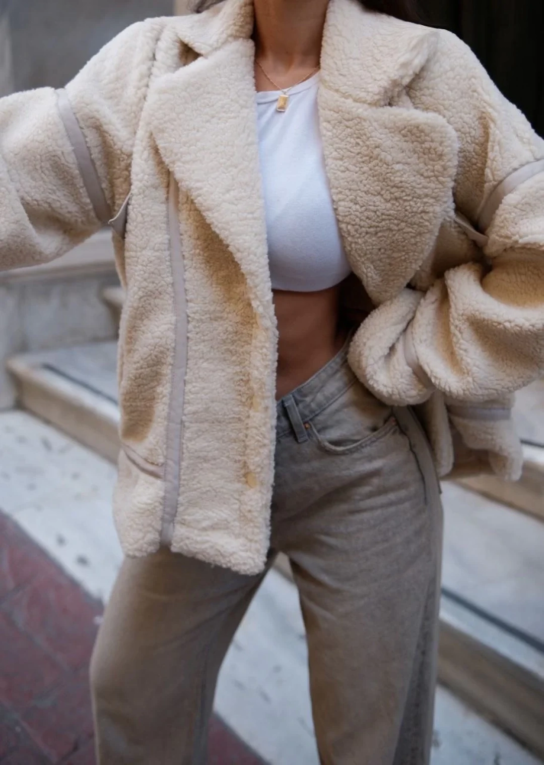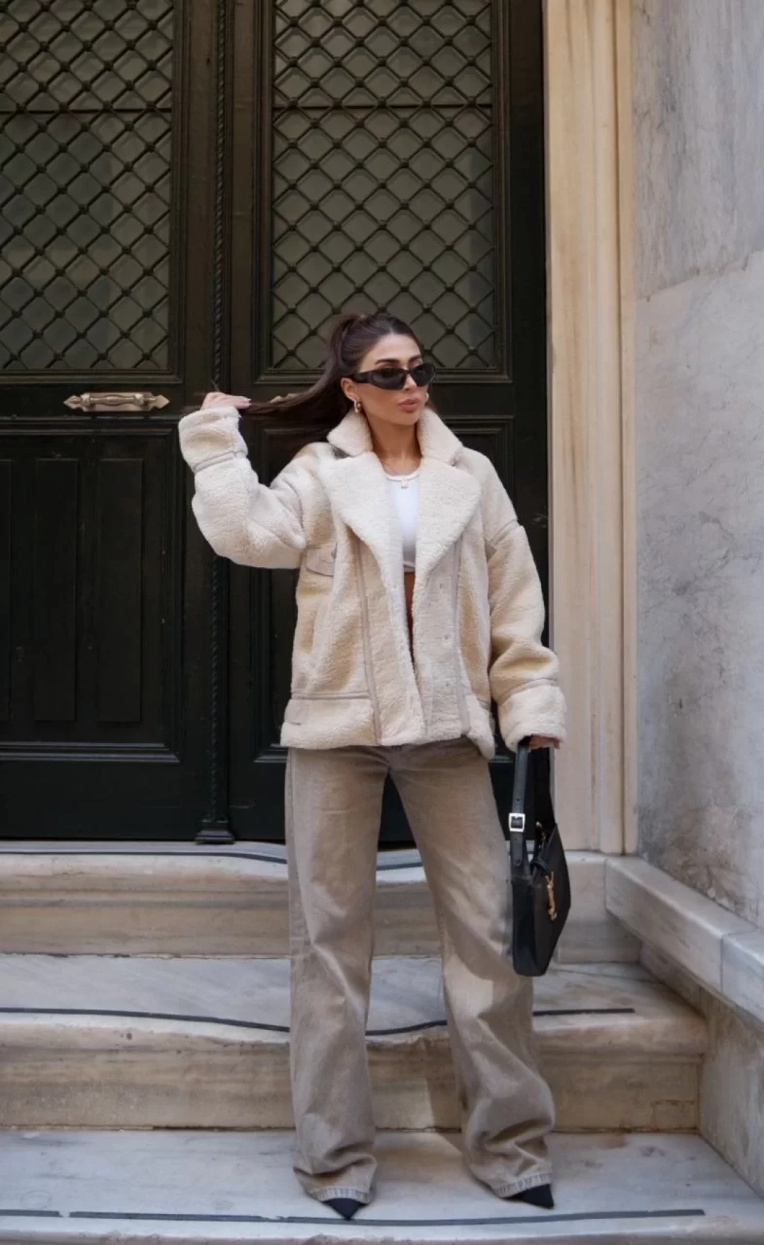 Cıt Cıt Detaylı Peluş Mont Ceket - Beyaz