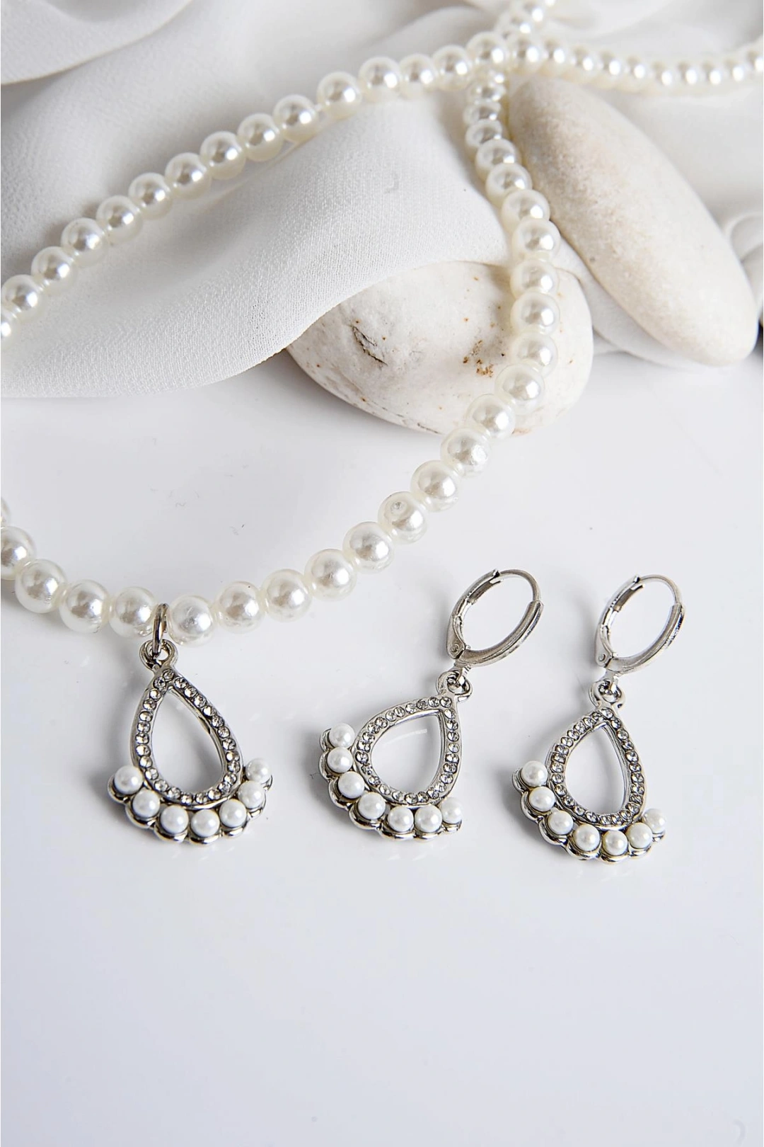 Zarif tasarımıyla dikkat çeken bu kolye küpe takımı, zamak kaplama materyali sayesinde uzun süreli kullanım için idealdir; İnci ve zirkon taş detaylarıyla süslenmiş bu set, göz alıcı bir parlaklık ve şıklık sunar; Her türlü özel gününüzde veya günlük kullanımda tercih edebileceğiniz bu takı, zarafetiyle farkınızı ortaya koyar;