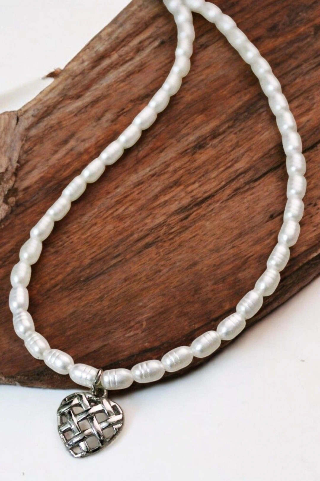 Desenli İncili Kalp Tasarımlı Gümüş Kaplamalı İnci Kolye