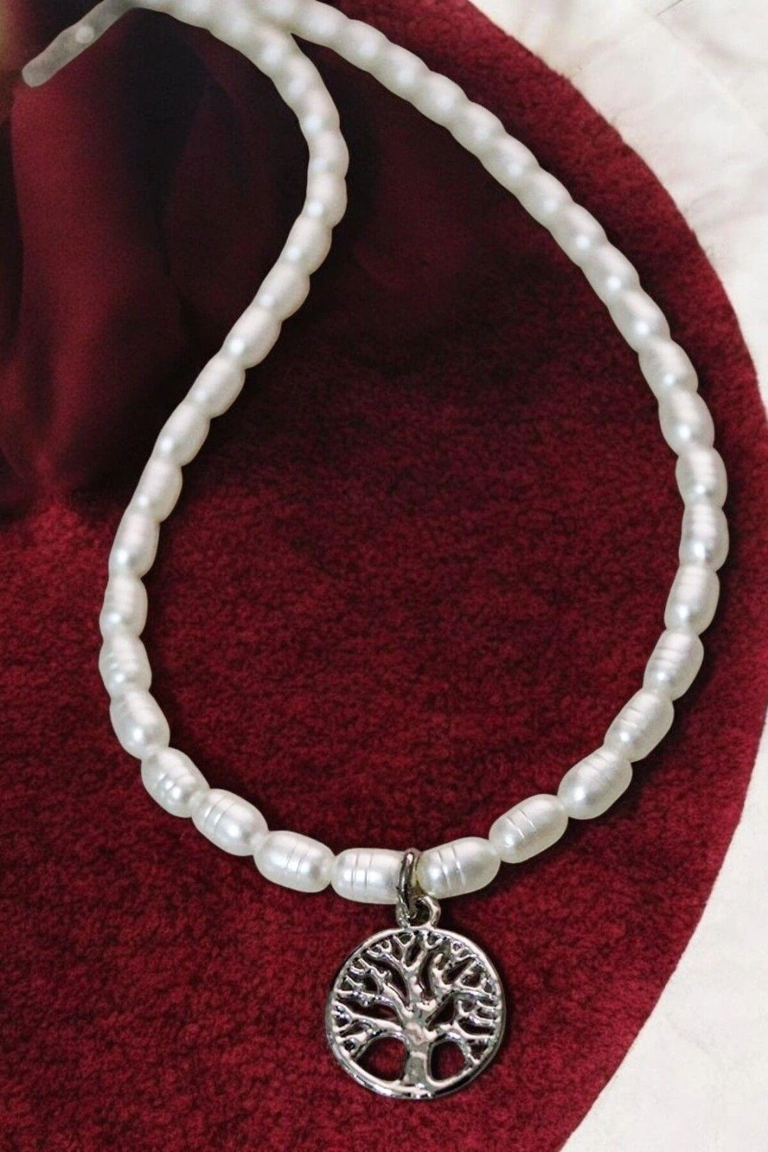 Desenli İncili Yaşam Ağacı Tasarımlı Gümüş Kaplamalı İnci Kolye