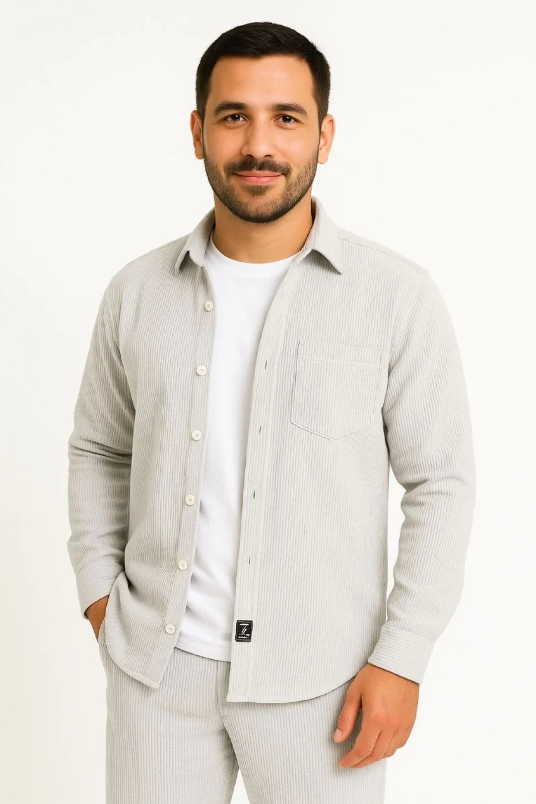Erkek Fitilli Kadife Cepli Gömlek Oversize Rahat Kalıp - Gri