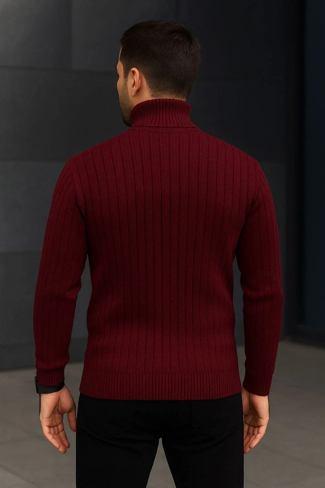 Erkek Fitilli Triko Kazak 2'li Set Bordo Siyah Regular Balıkcı Yaka Tam Boğazlı Triko Seti Modeli Kazak