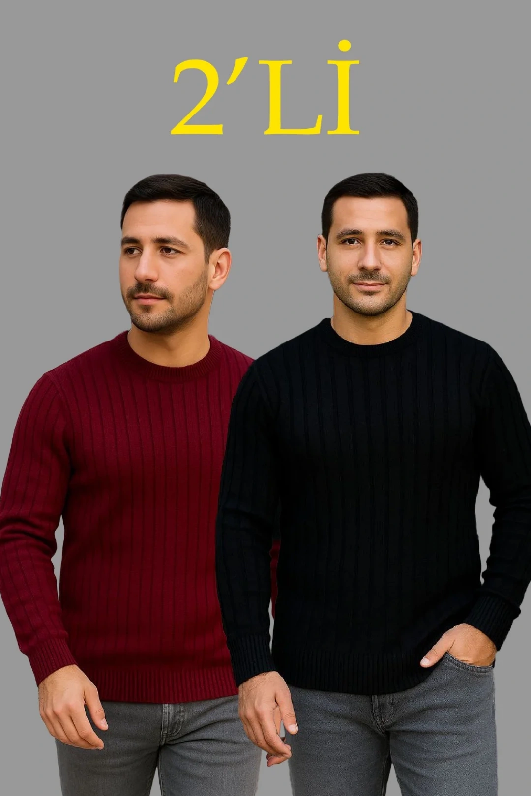 Erkek Fitilli Triko Kazak 2’li Set – Siyah & Bordo, Kalın Dokuma Pamuklu Regular Fit Bisiklet Yaka Uzun Kollu Rahat Kışlık Kazak Kombini