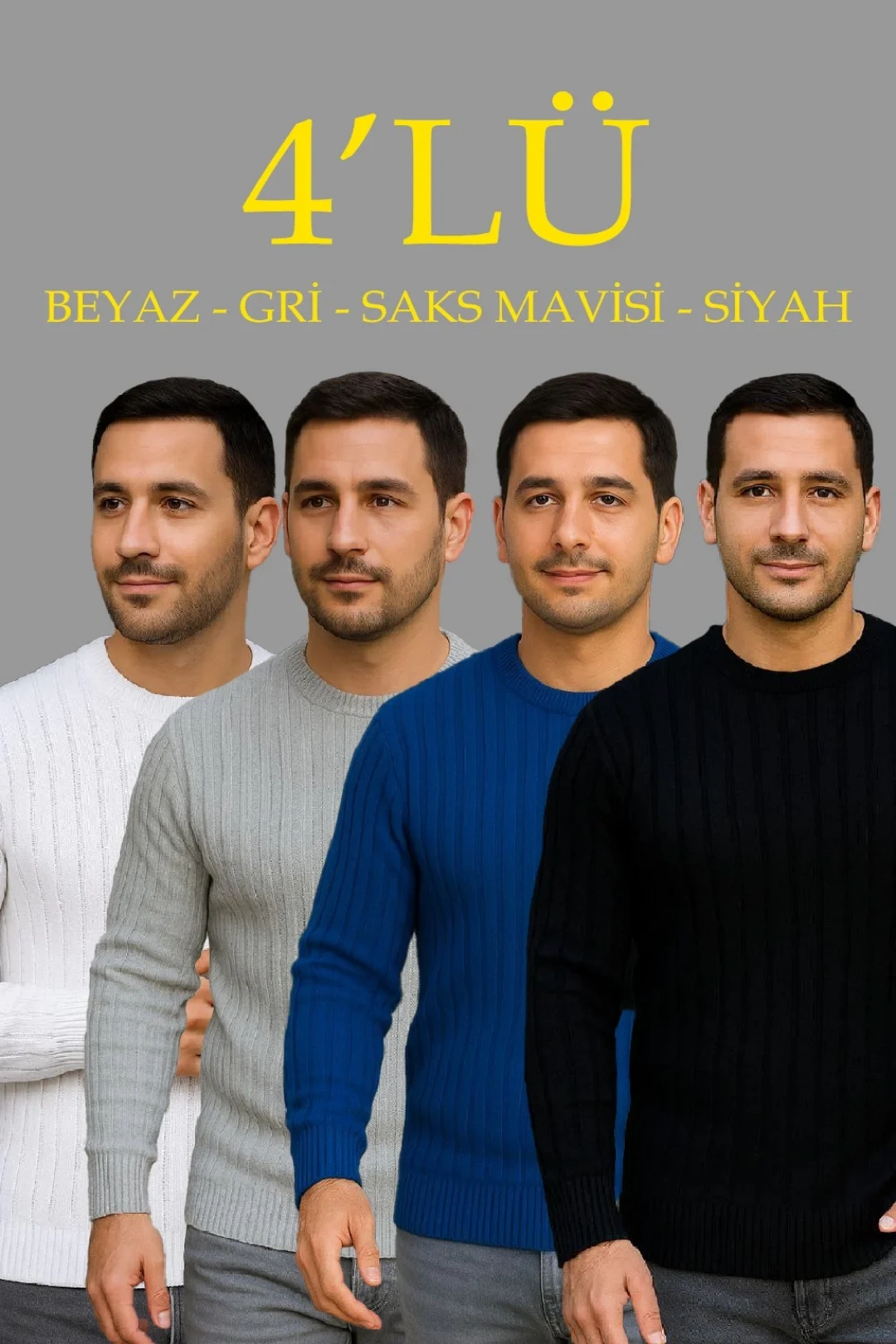 Erkek Fitilli Triko Kazak 4’lü Set – Beyaz, Saks Mavisi, Gri, Siyah | Kalın Dokuma Pamuklu Regular Fit Bisiklet Yaka Uzun Kollu Kışlık ve Baharlık Rahat Triko Kombini