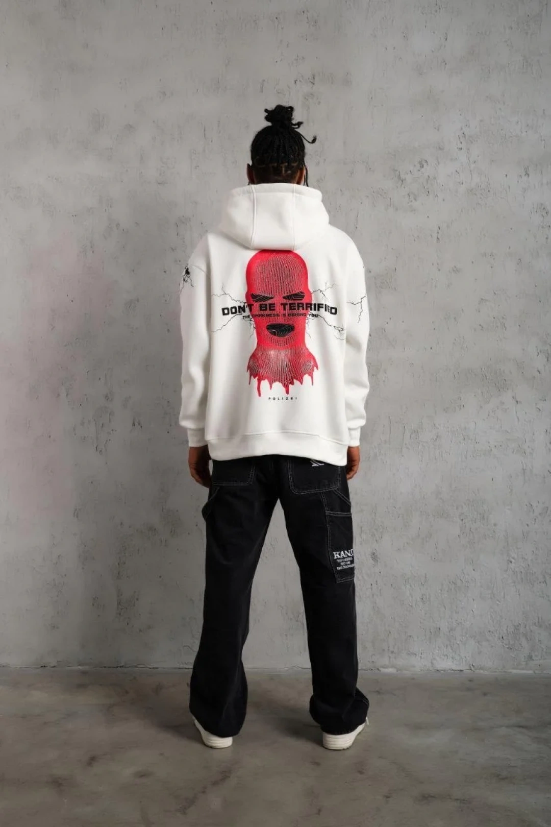 Erkek Oversize Üç İplik Kapüşonlu Sweatshirt – “Don’t Be Terrified” Ön, Sırt ve Kol Baskılı, Kanguru Cepli, Ribanalı Rahat Model - Beyaz