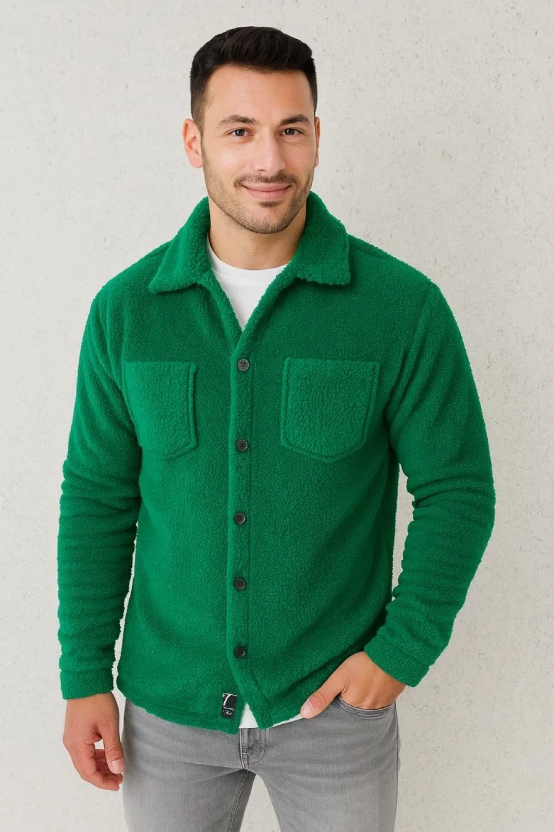 Erkek Pelüş Polar Hırka Gömlek – Yakalı, İlik Düğmeli, Göğüs Cepli, Yumuşak Dokulu Kışlık Regular Fit Rahat Günlük Model - Çimen Yeşili