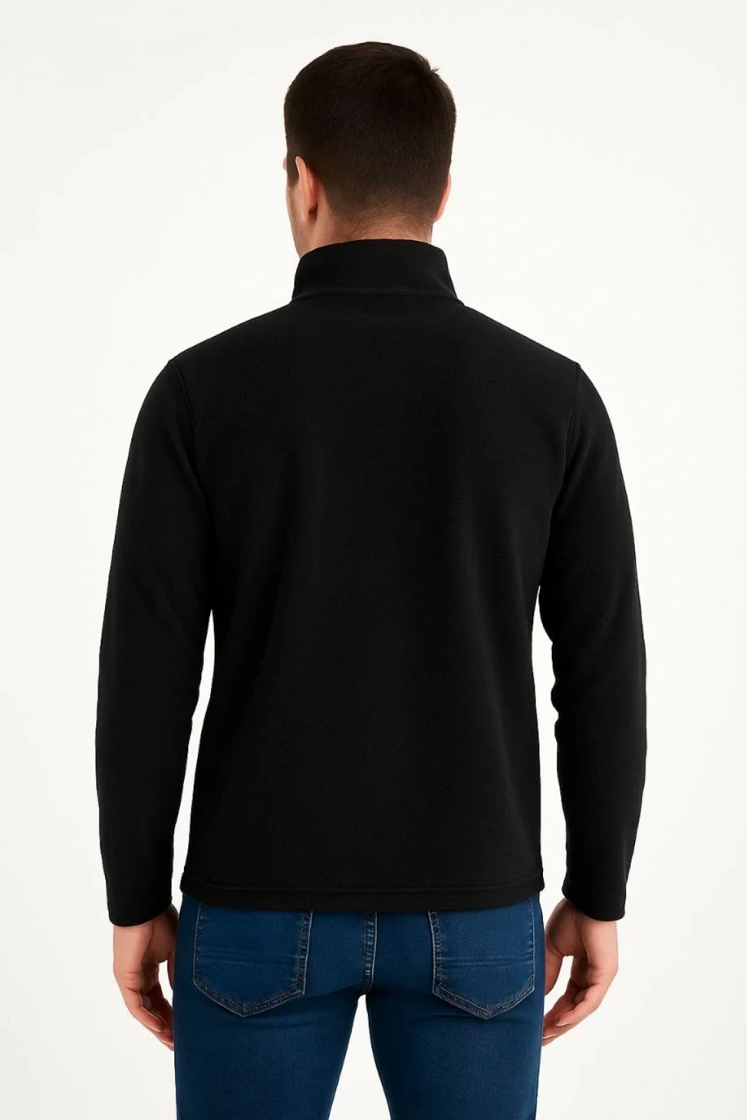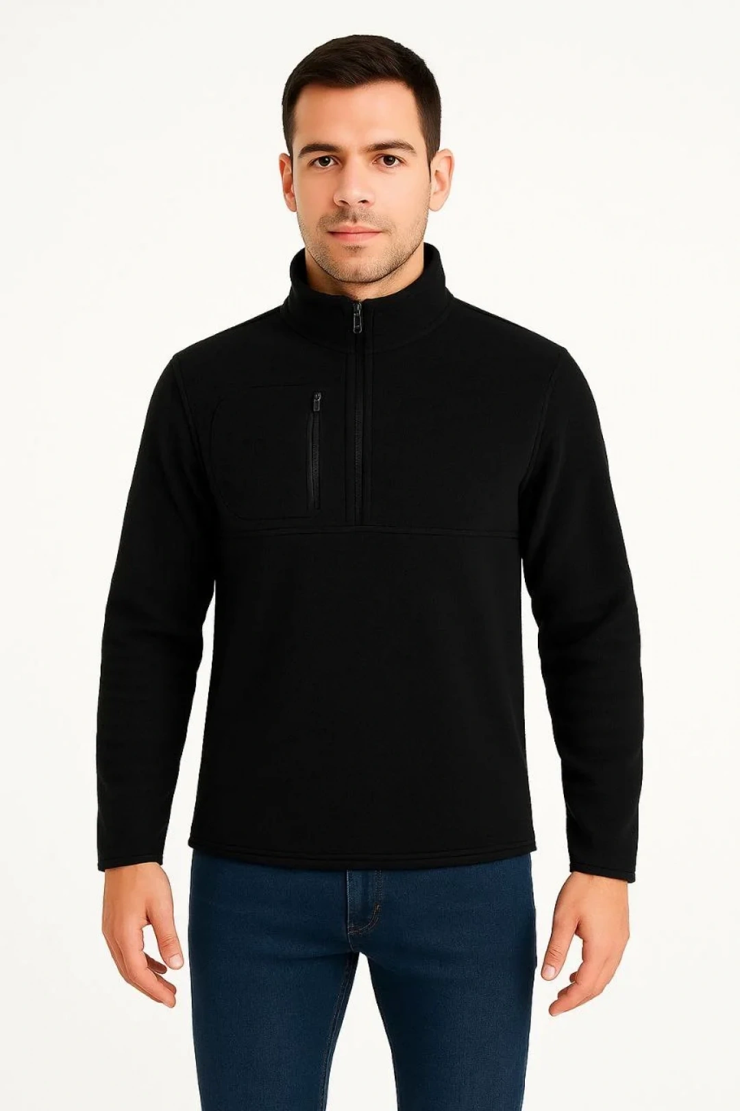 Erkek Polar Kazak – Dik Yaka, Yarım Fermuarlı, Fermuarlı Göğüs Cepli, Siyah Biyeli, Kışlık Rahat Regular Fit Günlük Model - Siyah