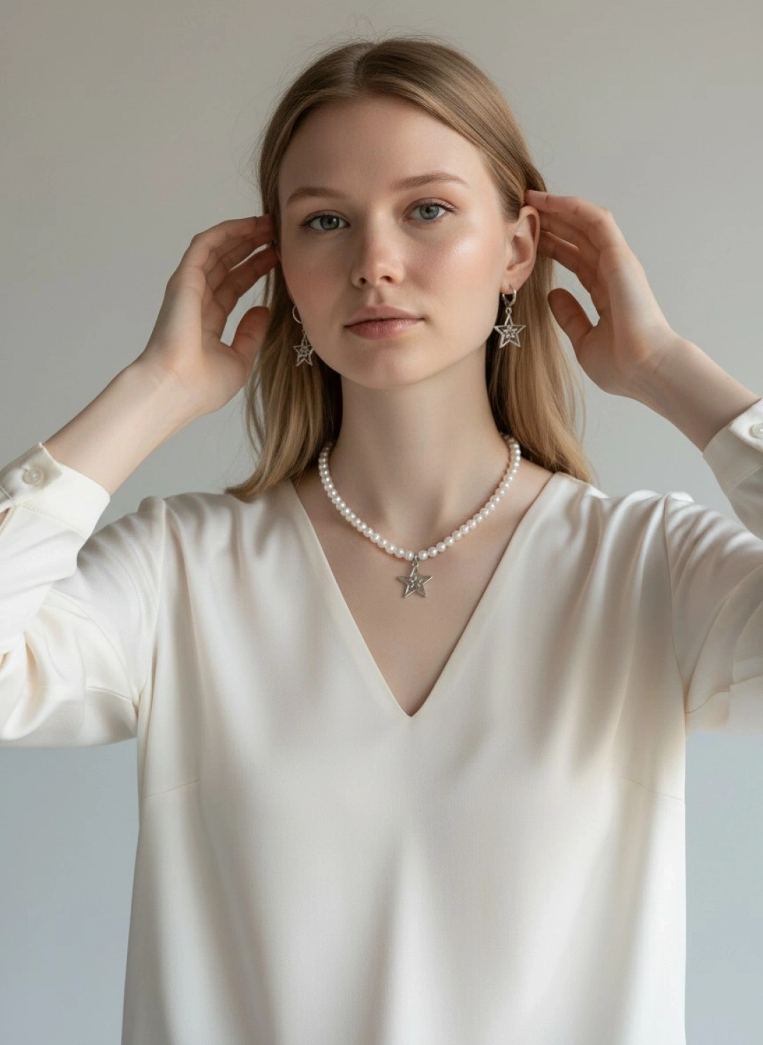 İç içe Yıldız Tasarımlı İnci Boncuklu Kolye Küpe Takım