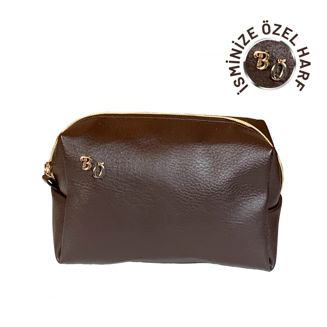 İsme Özel Baş Harfleri ile Kişiselleştirilebilir Makyaj Çantası Kahverengi