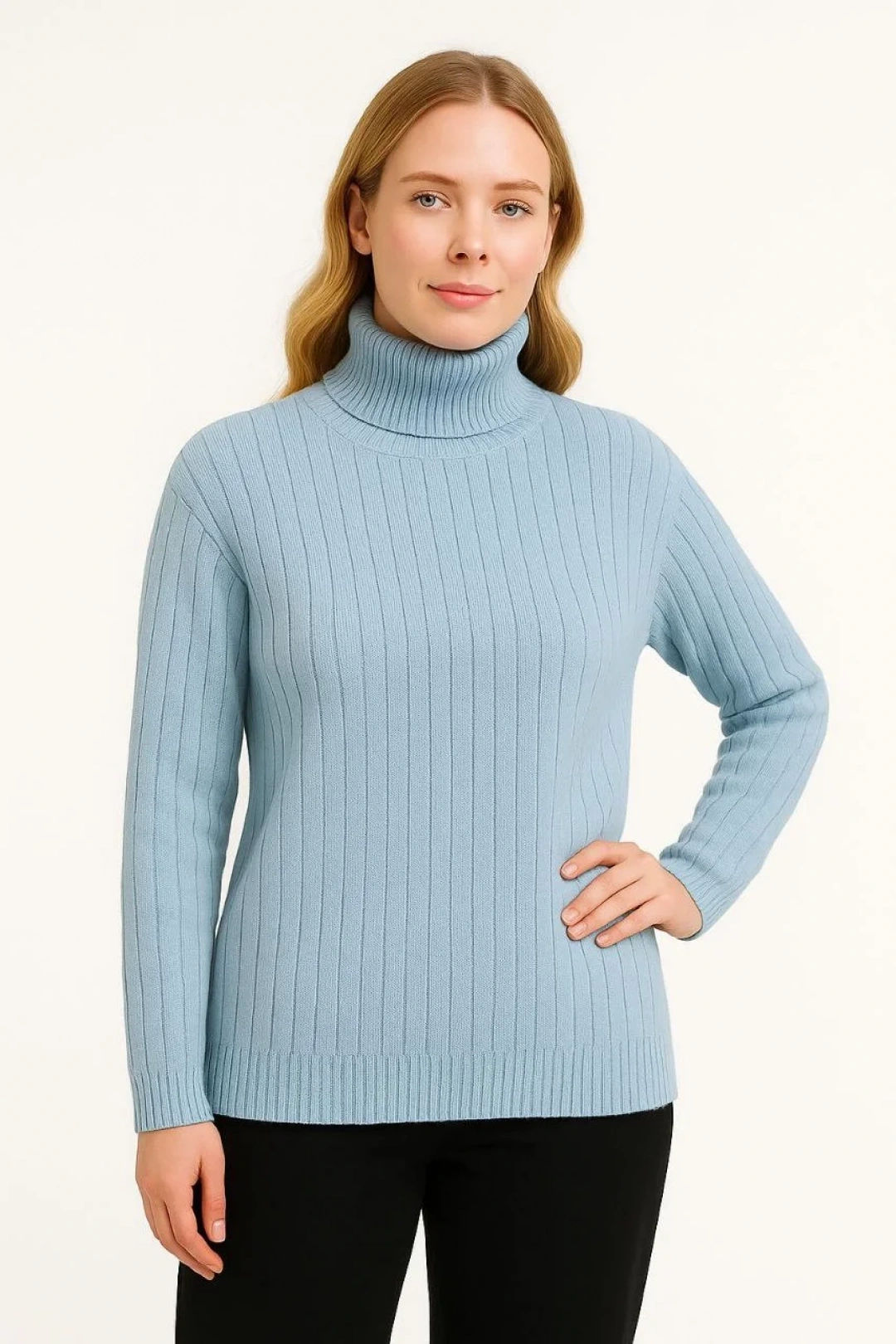 Kadın Balıkcı Yaka Bağazlı Triko Kazak Pamuklu Kalın Fitilli Dokuma - Bebek Mavisi