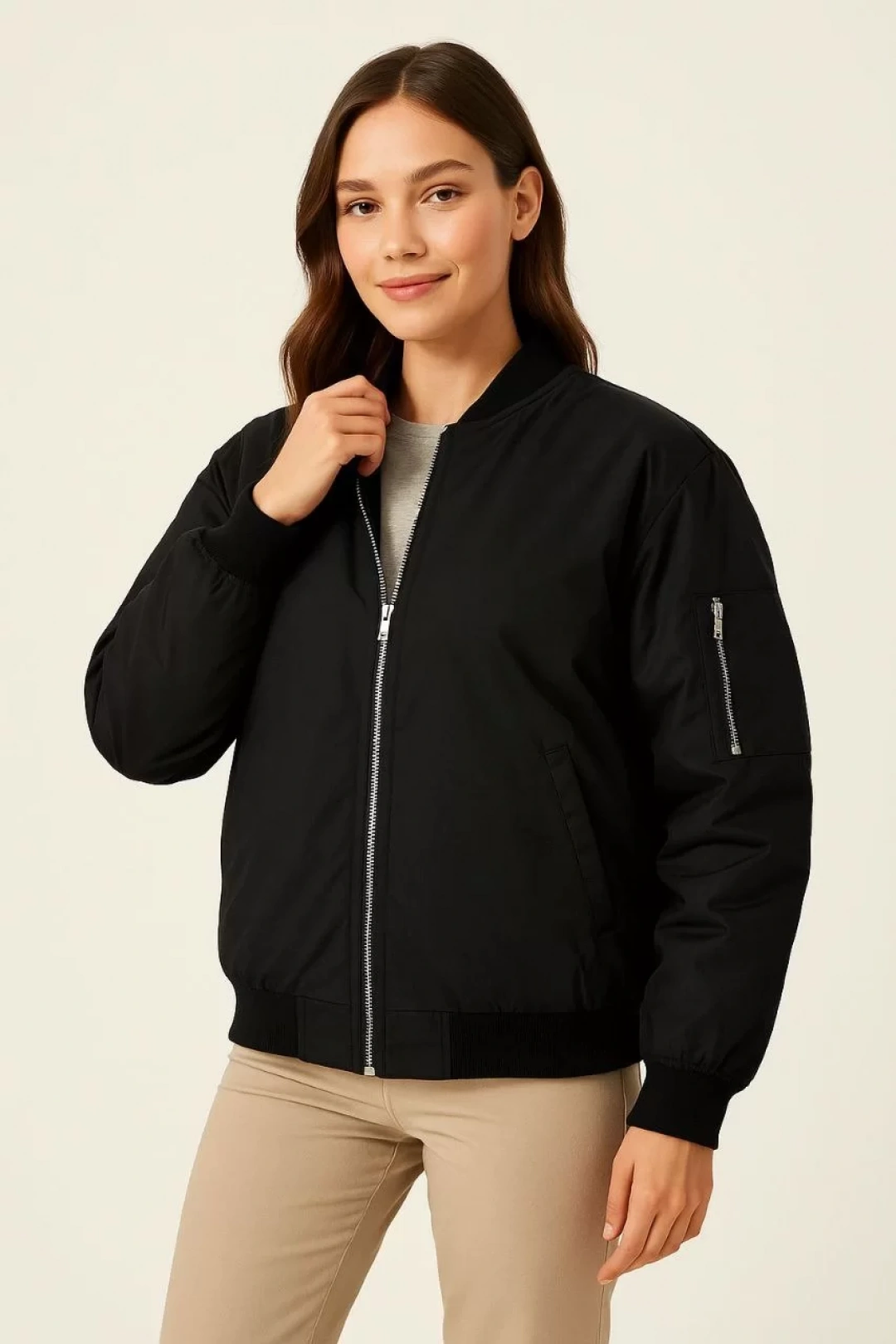 Kadın içi Astarlı Fermuarlı Bomber Mont Ceket - Siyah