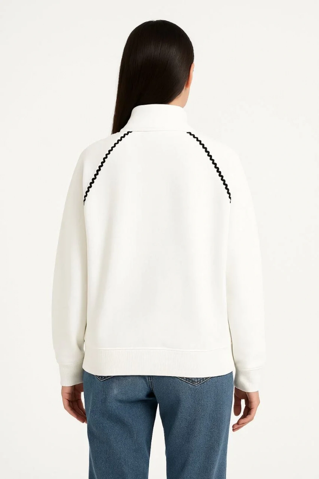 Kadın Oversize Dik Yaka Fermuarlı Sweatshirt - Zincir Nakışli Kanguru Cepli, - Beyaz