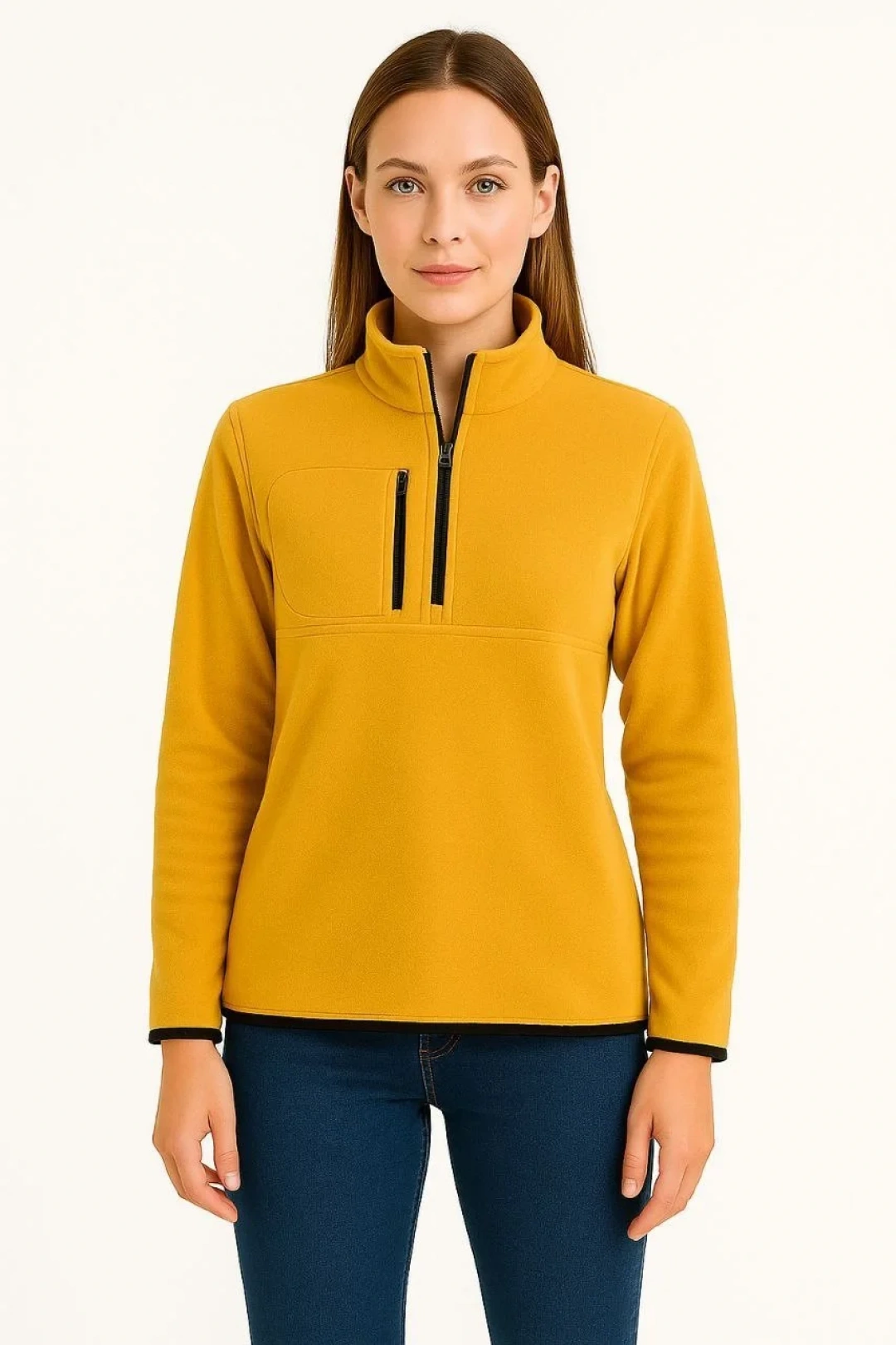 Kadın Polar Kazak – Dik Yaka, Yarım Fermuarlı, Fermuarlı Göğüs Cepli, Siyah Biyeli, Kışlık Rahat Regular Fit Günlük Model - Sarı