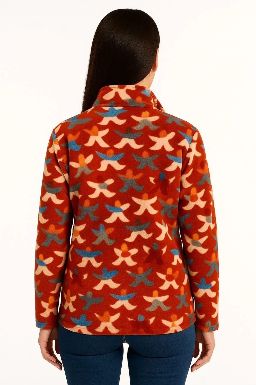 Kadın Tam Fermuarlı Desenli Polar Sweat – Siyah Multicolor Figür Desen Yakalı, Uzun Kollu, Oversize Rahat Kalıp - Kiremit