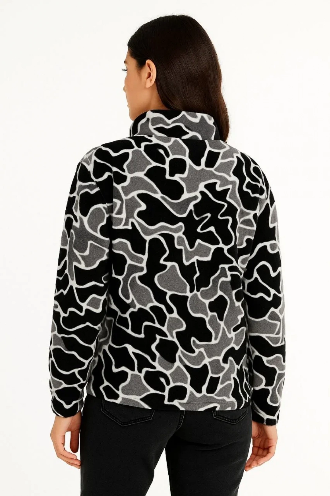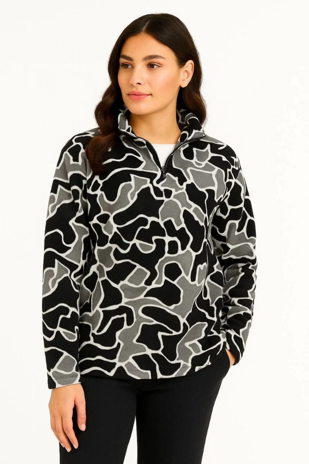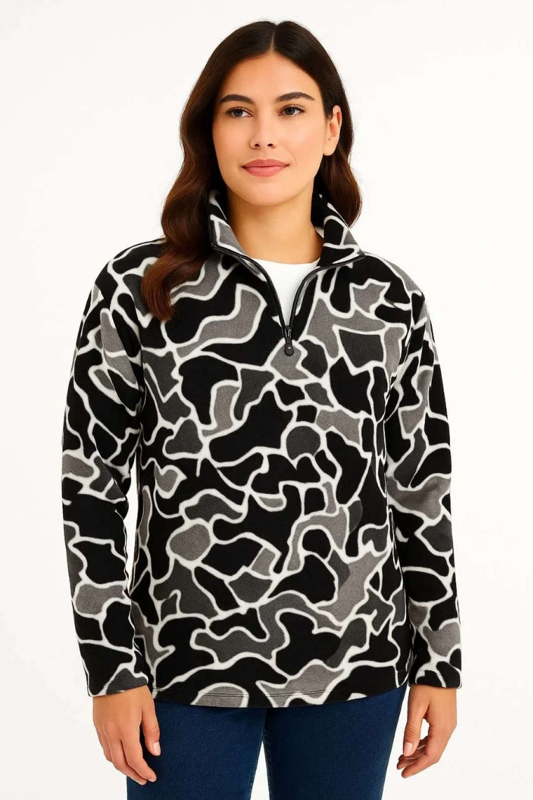 Kadın Yarım Fermuarlı Desenli Polar Sweat – Haki Kamuflaj Yakalı, Uzun Kollu, Oversize Rahat Kalıp - Haki