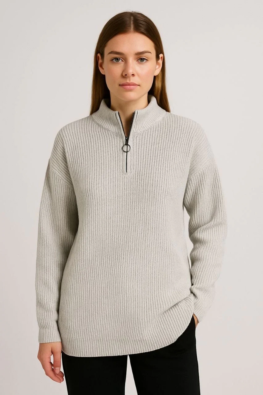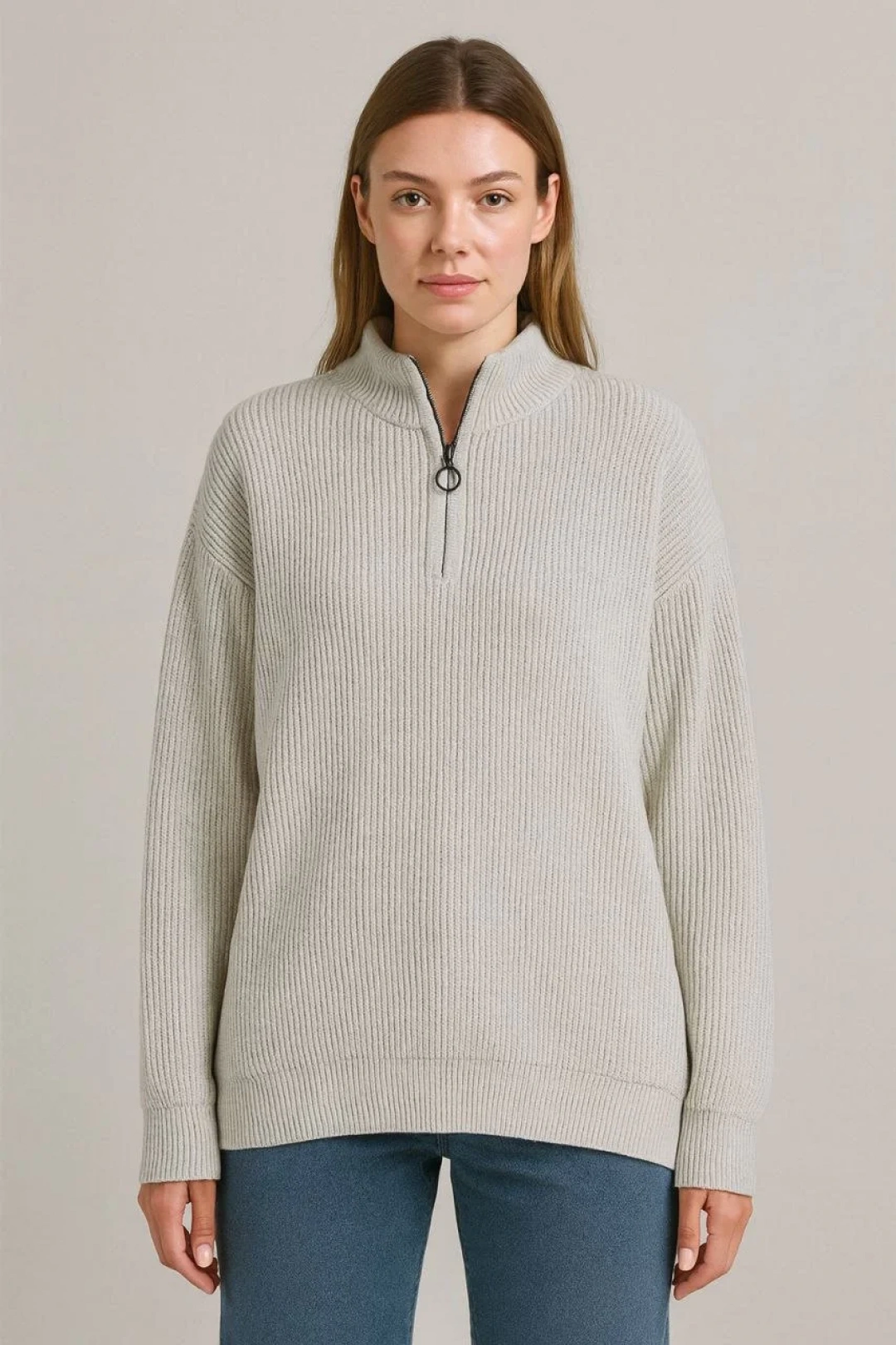 KADIN Yarım Fermuarlı Triko Kazak – Selanik Örgü, Dik Yaka, Pamuklu Dokuma, Oversize Uzun Kollu Kışlık Model - Bej
