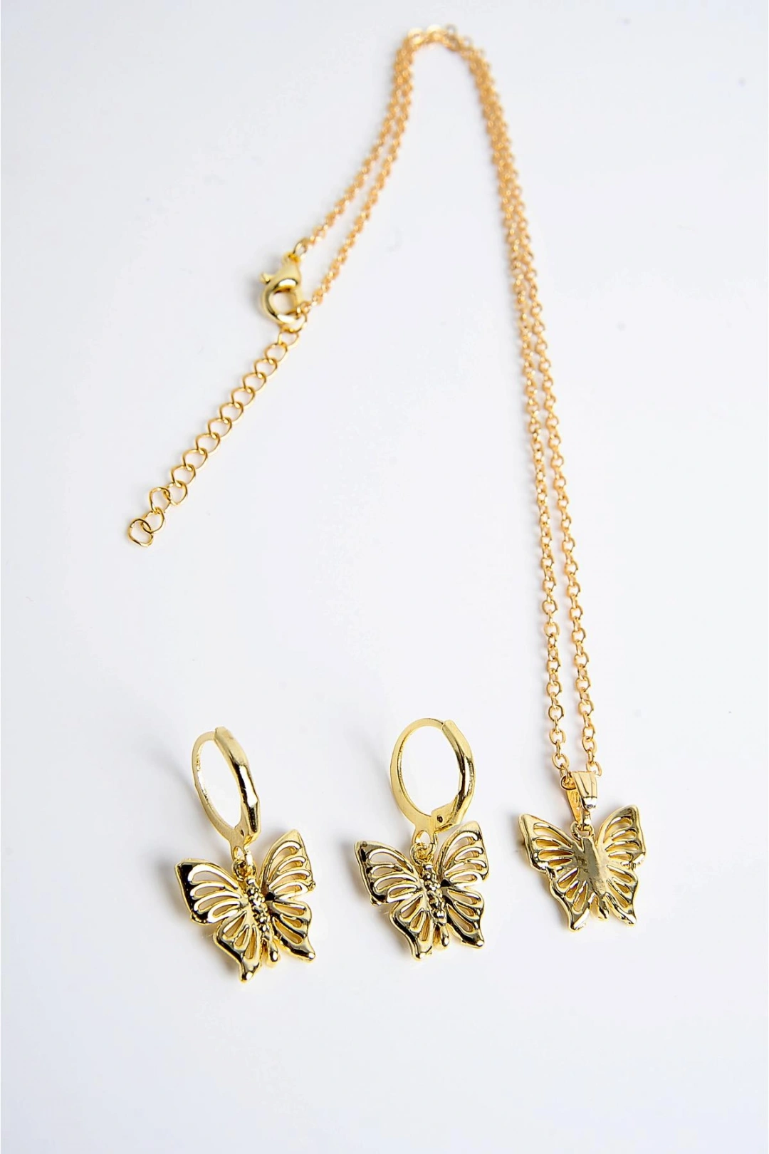 Kelebek Tasarımlı Gold Renkli Kolye Küpe Seti ; Ürün temizliğini pamuklu bir bez ile yapabilirsiniz ; Kimyasal maddelerle teması olmaması dahilinde kararma yapmaz ; Anti Alerjiktir cilt de herhangi bir kızarıklık vb.; olumsuz etki oluşturmaz ; İş günleri 24 saat içinde kargoda ; Sevgiliye alınacak hediye ; Anneye alınacak hediye ; Kızıma alınacak hediye ; Notlu Hediye Paketi ;