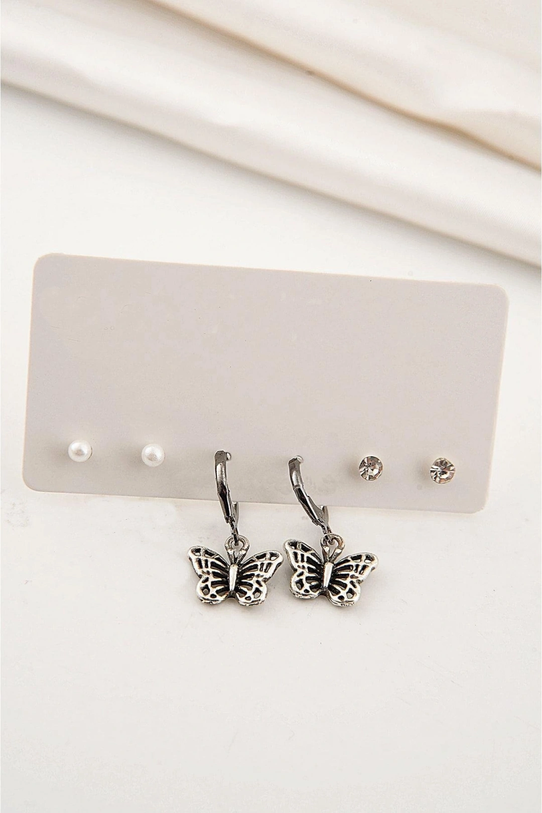 Gümüş kaplama malzemesiyle üretilmiş, uzun ömürlü ve şık bir aksesuar deneyimi sunar; Sallantılı modeli sayesinde zarif ve göz alıcı bir görünüm sağlar, her türlü kıyafetle kolayca uyum sağlar; Kelebek tasarımlı detayları ile feminen ve sofistike bir stil vurgusu yapar;
