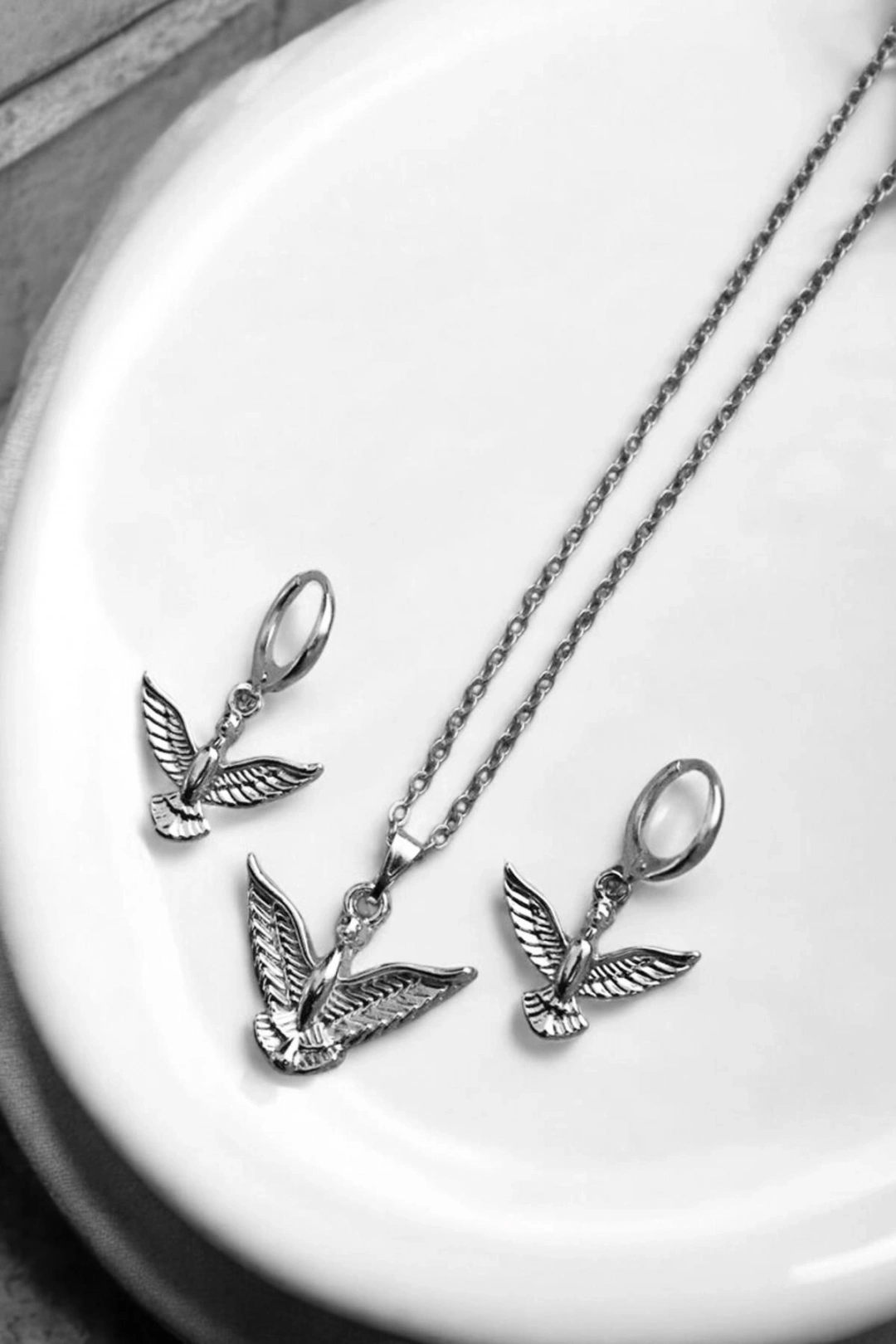 - Zarif Melek Tasarımı ile dikkat çeken bu kolye küpe takımı, her türlü özel gününüzde şıklığınızı tamamlar.; ; - Dayanıklı zamak kaplama materyali sayesinde uzun süreli kullanım sunar ve parlaklığını korur.; ; - Üç parçadan oluşan set; kolye, küpe ve bileklikten oluşarak kombinlerinizde uyumlu bir görünüm sağlar.; ; - Taş detay içermeyen bu takım, minimalist tarzınıza modern bir dokunuş eklerken gümüş rengiyle her ortama uyum sağlar.; ; - Hem kadın hem de kız kullanıcılar için ideal olan bu set, günlük giyimden özel davetlere kadar geniş bir yelpazede tercih edilebilir.
