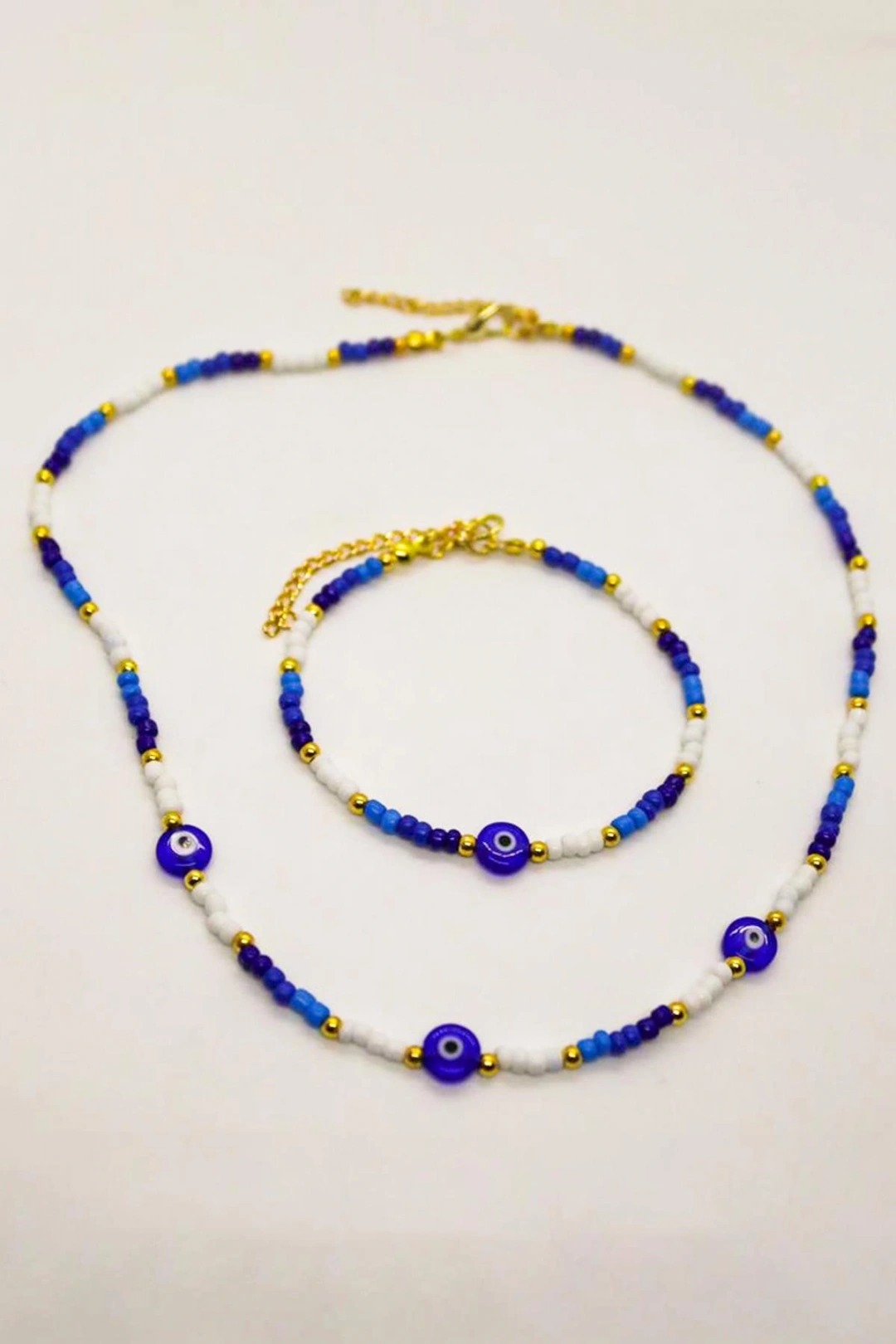 Zarif boncuk detaylarıyla süslenmiş, göz alıcı bir tasarıma sahip nazar boncuğu figürlü kolye ve bileklik takımı; Zirkon kaplama malzemesi ile zenginleştirilmiş, uzun ömürlü ve parlak bir görünüm sunar; Hem kolye hem de bileklik olarak kullanılabilen bu takım, şıklığınızı tamamlayacak çok yönlü bir aksesuar seçeneği sunar; Özel günlerde veya günlük kullanımda rahatlıkla tercih edebileceğiniz bu takım, zarafetiyle dikkat çeker;