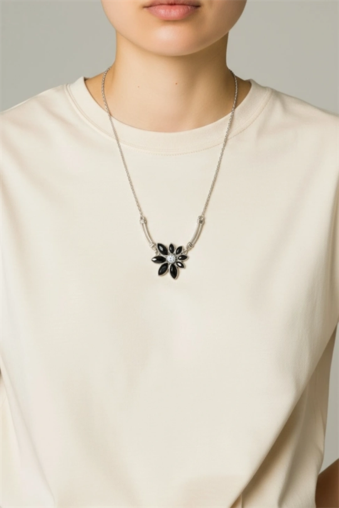 Çiçek tasarımlı Gümüş Kaplamalı Zincirli Kolye Gümüş kaplama malzemesiyle üretilmiş, uzun ömürlü ve şık bir görünüm sunar; siyah taş kullanımı sayesinde göz alıcı bir parlaklık ve estetik bir görünüm sağlar; siyah ve beyaz taşlı çiçek modeli, zarif tasarımıyla dikkat çeker ve her türlü kıyafetle uyum sağlar Ürün temizliğini pamuklu bir bez ile yapabilirsiniz . ; Kimyasal maddelerle teması olmaması dahilinde kararma yapmaz . ; Anti Alerjiktir ciltde herhangi bir kızarıklık vb. olumsuz etki oluşturmaz . ; İş günleri 24 saat içinde kargoda .