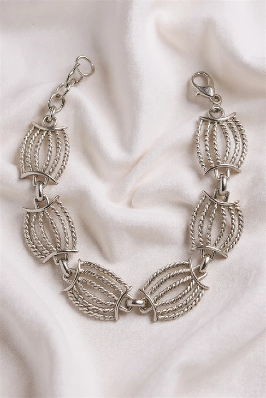 Zarif halat desenler ile süslenmiş, gümüş renkli figürleriyle dikkat çeken bu bileklik, şıklığınızı tamamlayacak bir aksesuar; ; Gümüş rengi sayesinde her türlü kıyafetle kolayca uyum sağlar ve günlük kullanım için idealdir; Özel günlerde veya günlük kullanımda tercih edebileceğiniz bu bileklik, zarafetiyle dikkat çeker; ürünlerimizde antialerjik kaplama mevcuttur
