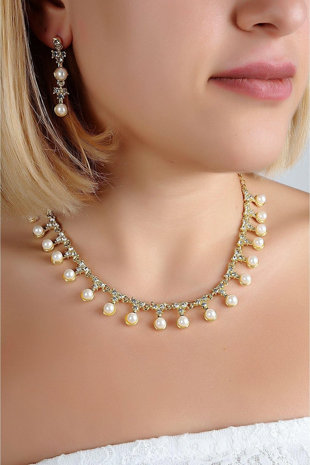 Beyaz İnci Tasarımlı Kolye Küpe Takı Seti