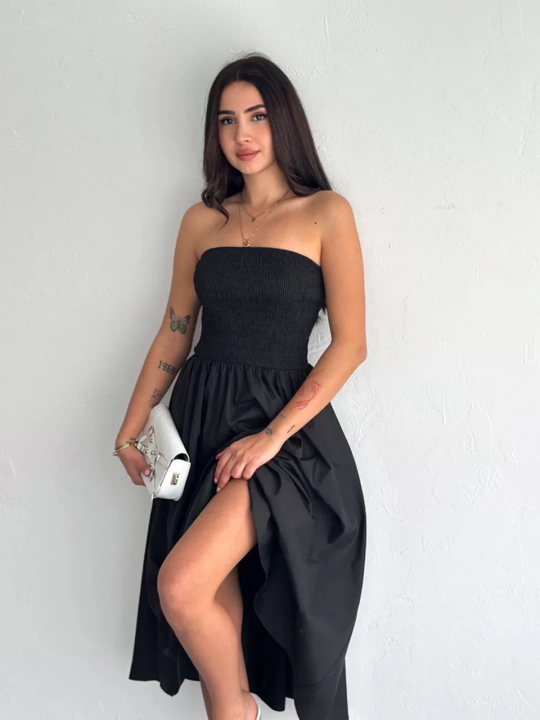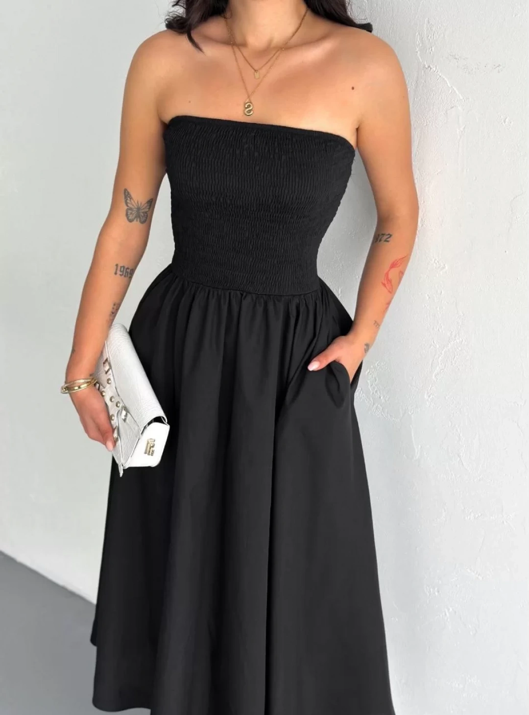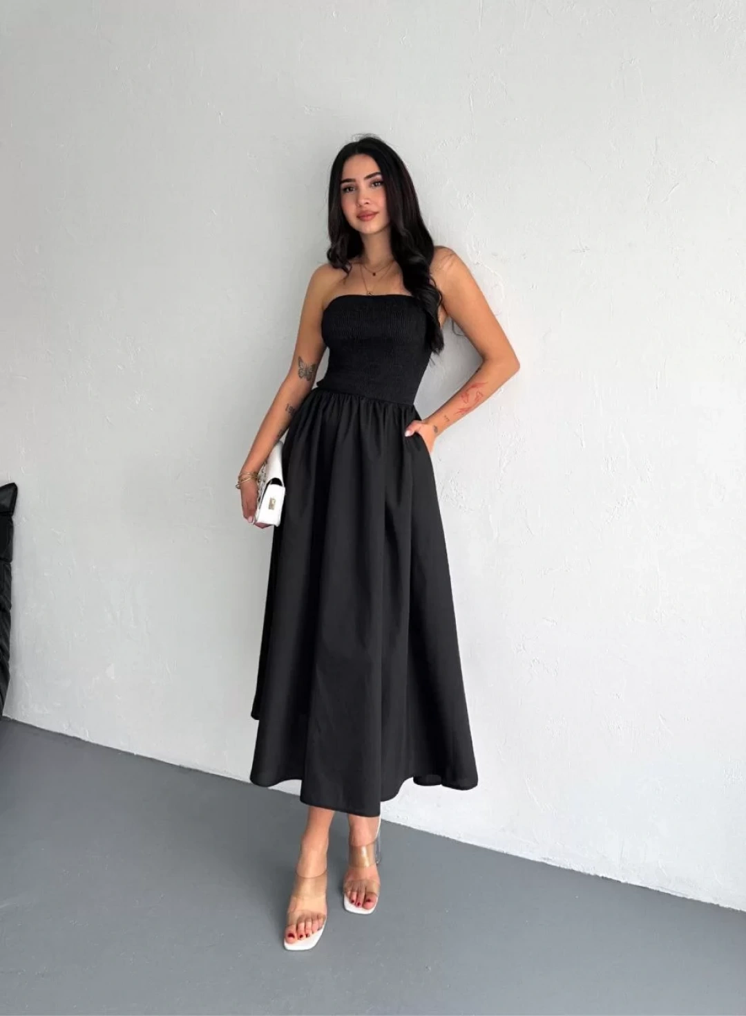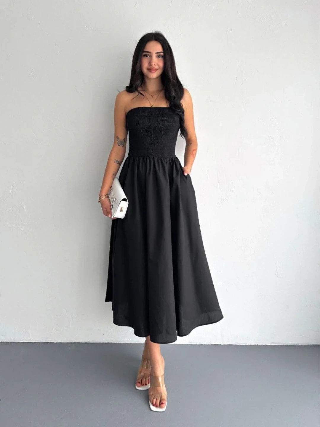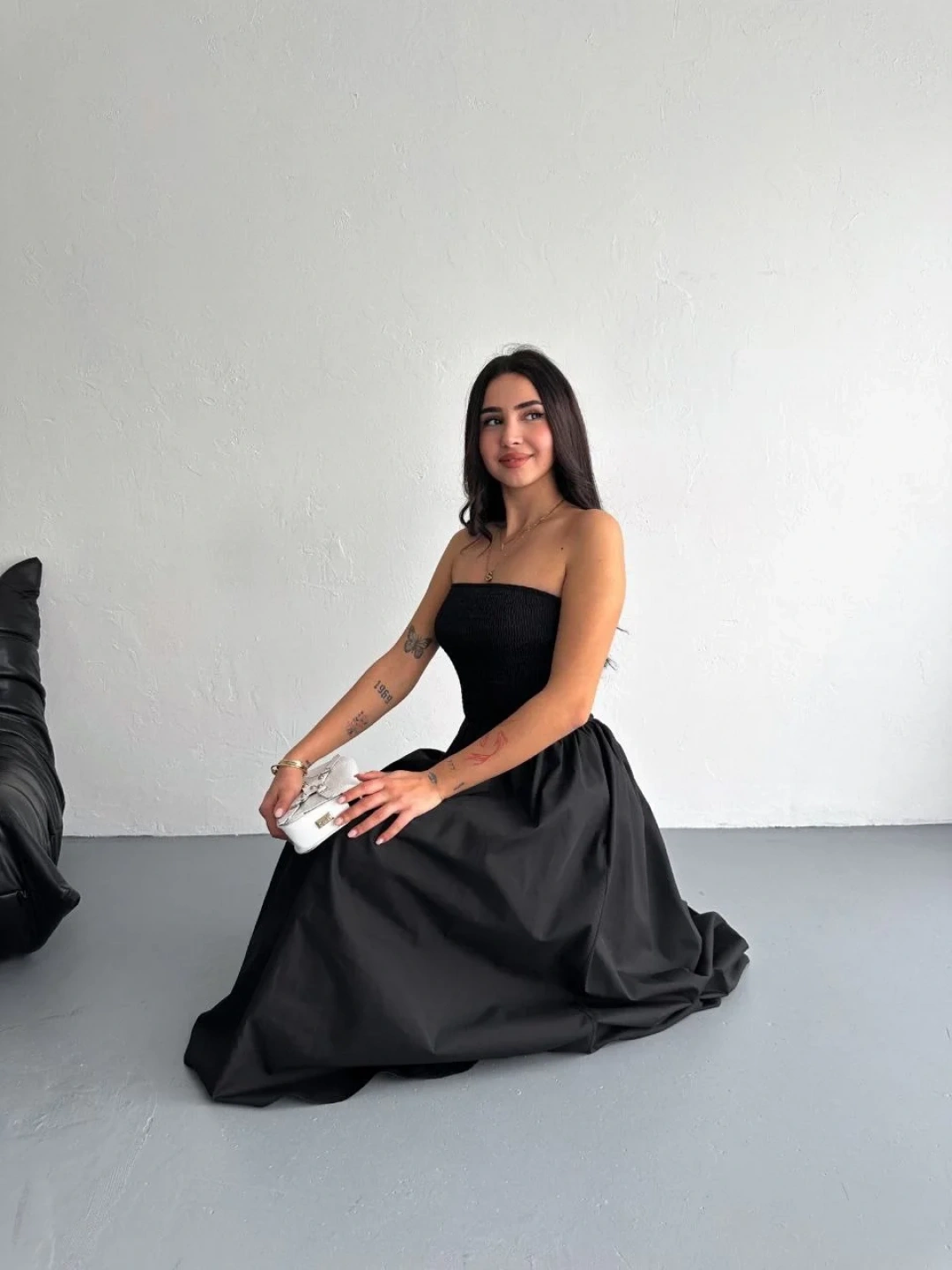 Kolsuz Yarım Bogazlı Uzun Elbise- Siyah
