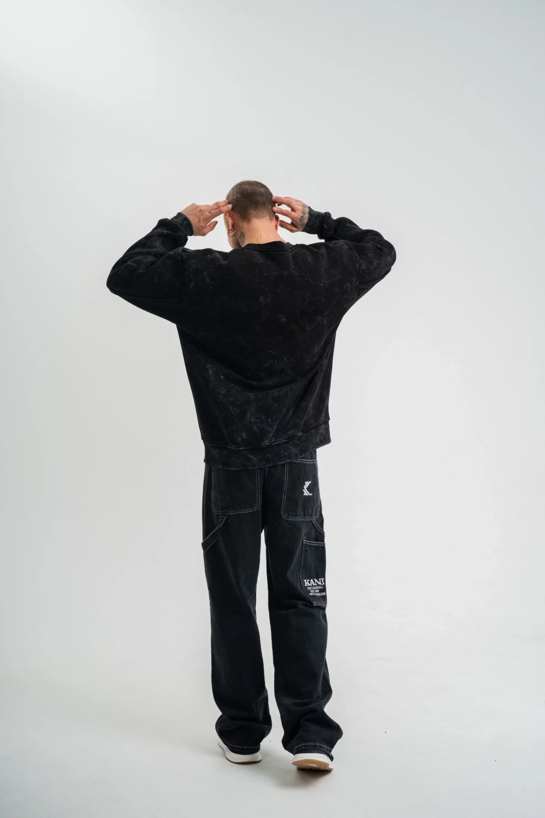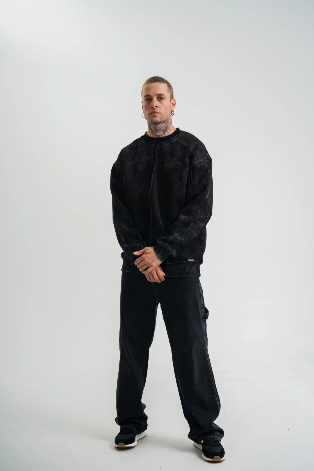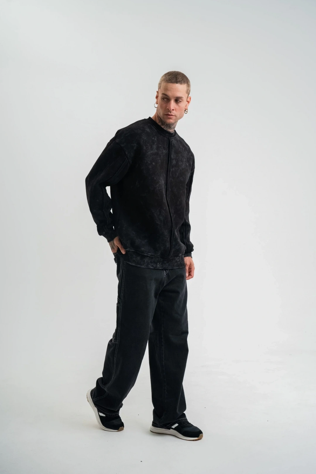 Unisex Bisiklet Yaka Özel Pis Dikişli Yıkamalı SweatShirt - Siyah