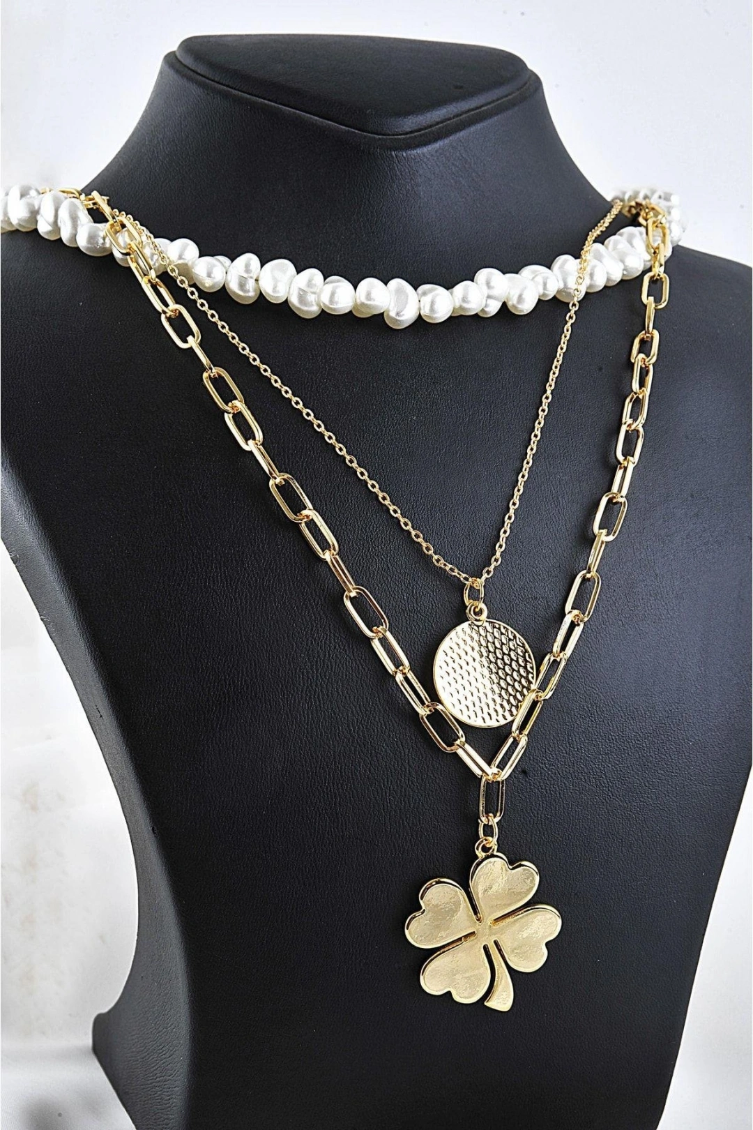 Zarif yonca tasarımlı cam inciler, ışıltınızı her ortamda ön plana çıkarır; Altın kaplama materyali ile hem şıklığı hem de dayanıklılığı bir arada sunar; Üçlü zincir yapısı, kolyenin uzun süreli kullanım için idealdir ve farklı stillerle kolayca kombinlenebilir; İnci detayları, klasik ve zamansız bir görünüm sağlayarak her türlü kıyafetle uyum içinde olmanızı sağlar;